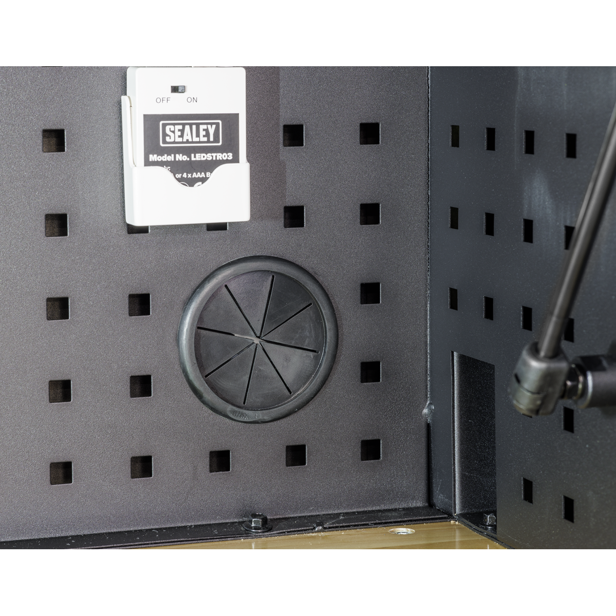• Hutch is supplied with a power strip (4 x 230V, 2 x 5V 2.4A USB sockets) which can be easily installed where needed as well as Sealey LED light strips.