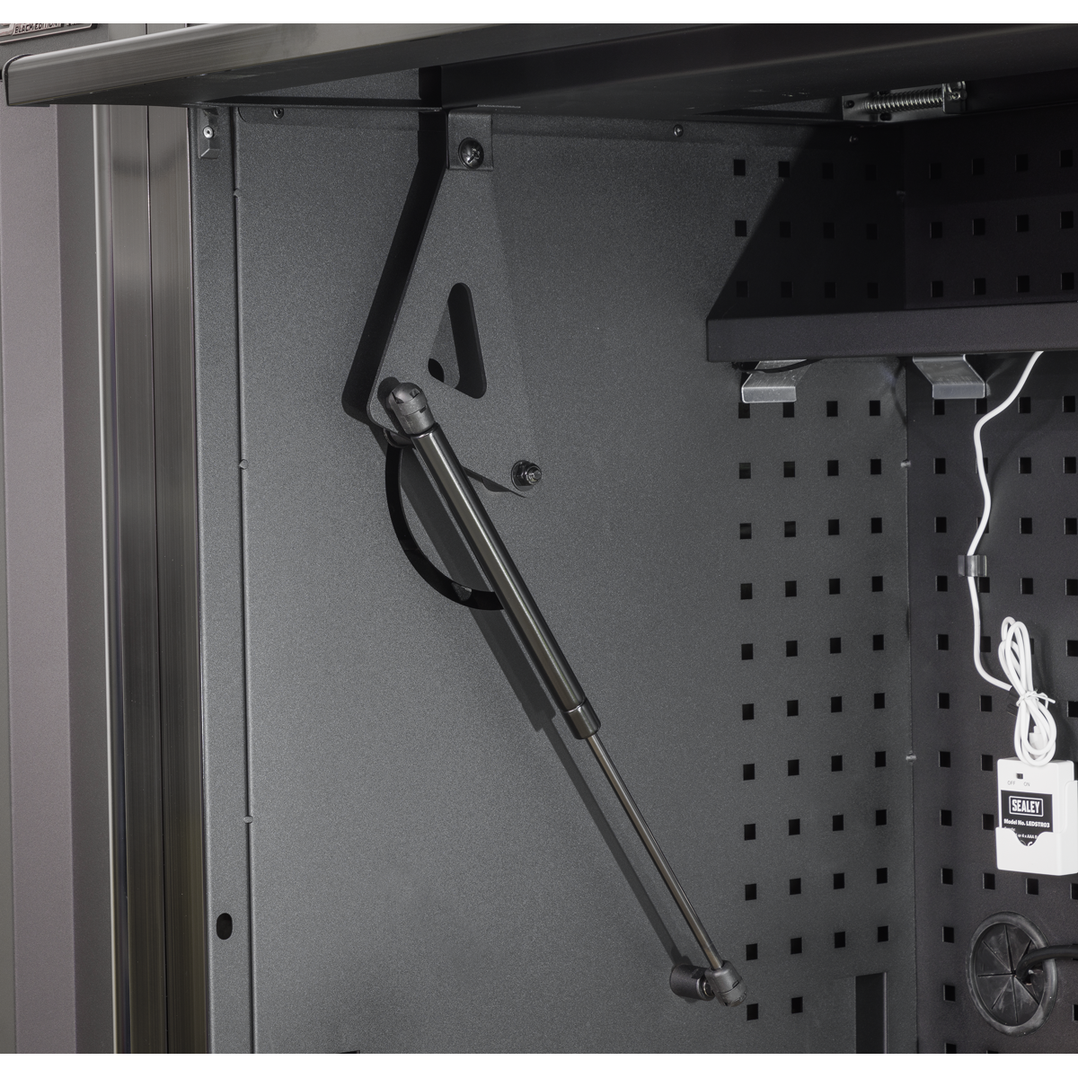 • Hutch style top chest features gas struts, single full-length powder coated shelf and pegboard back for easy tool storage. Pegboard is compatible with all Sealey TTS hooks.