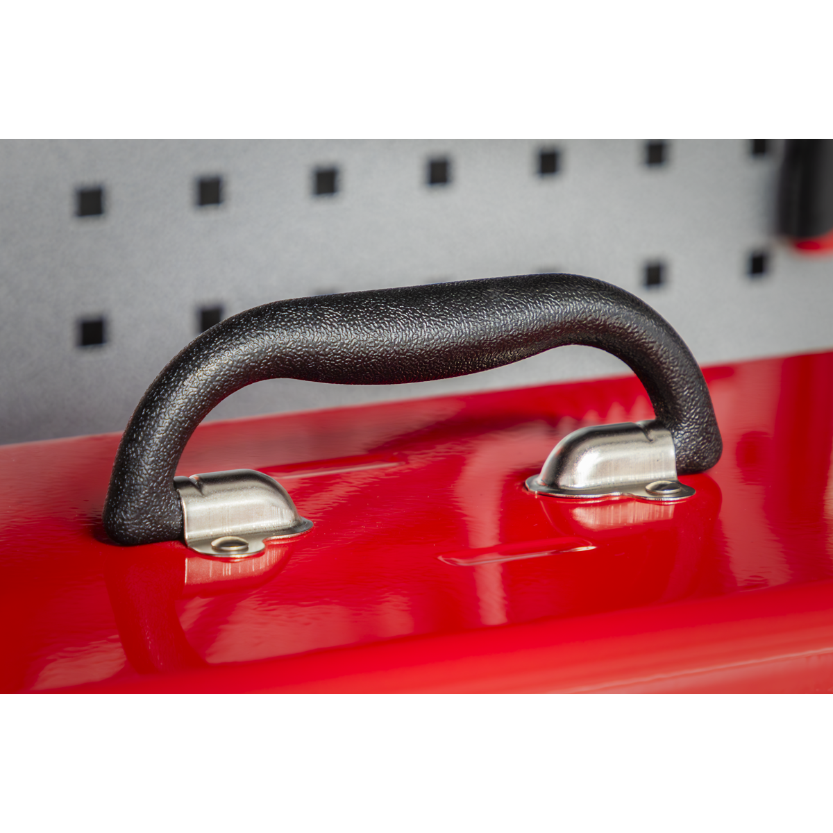 • Heavy-duty steel toolbox with integral tote tray and composite carry handle.