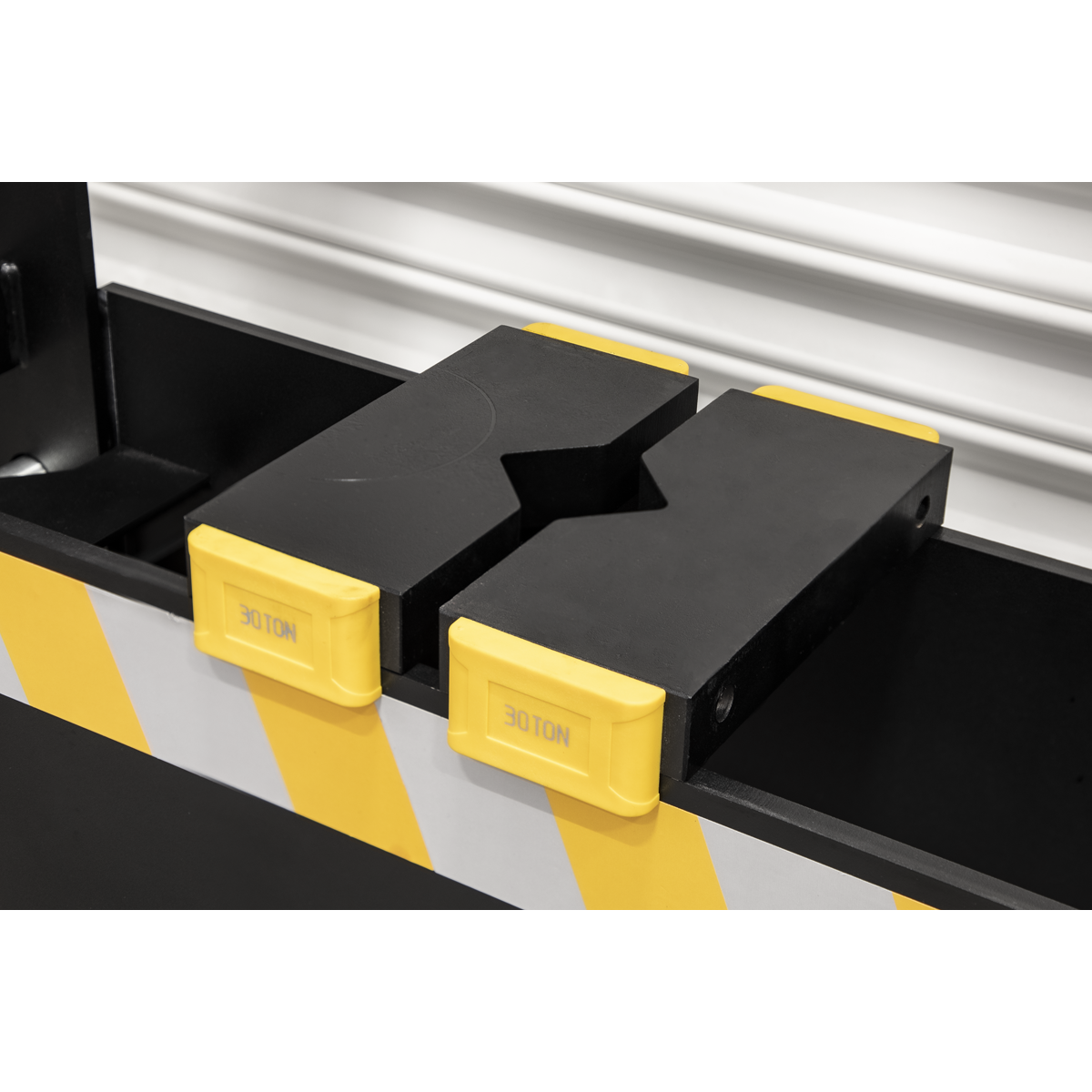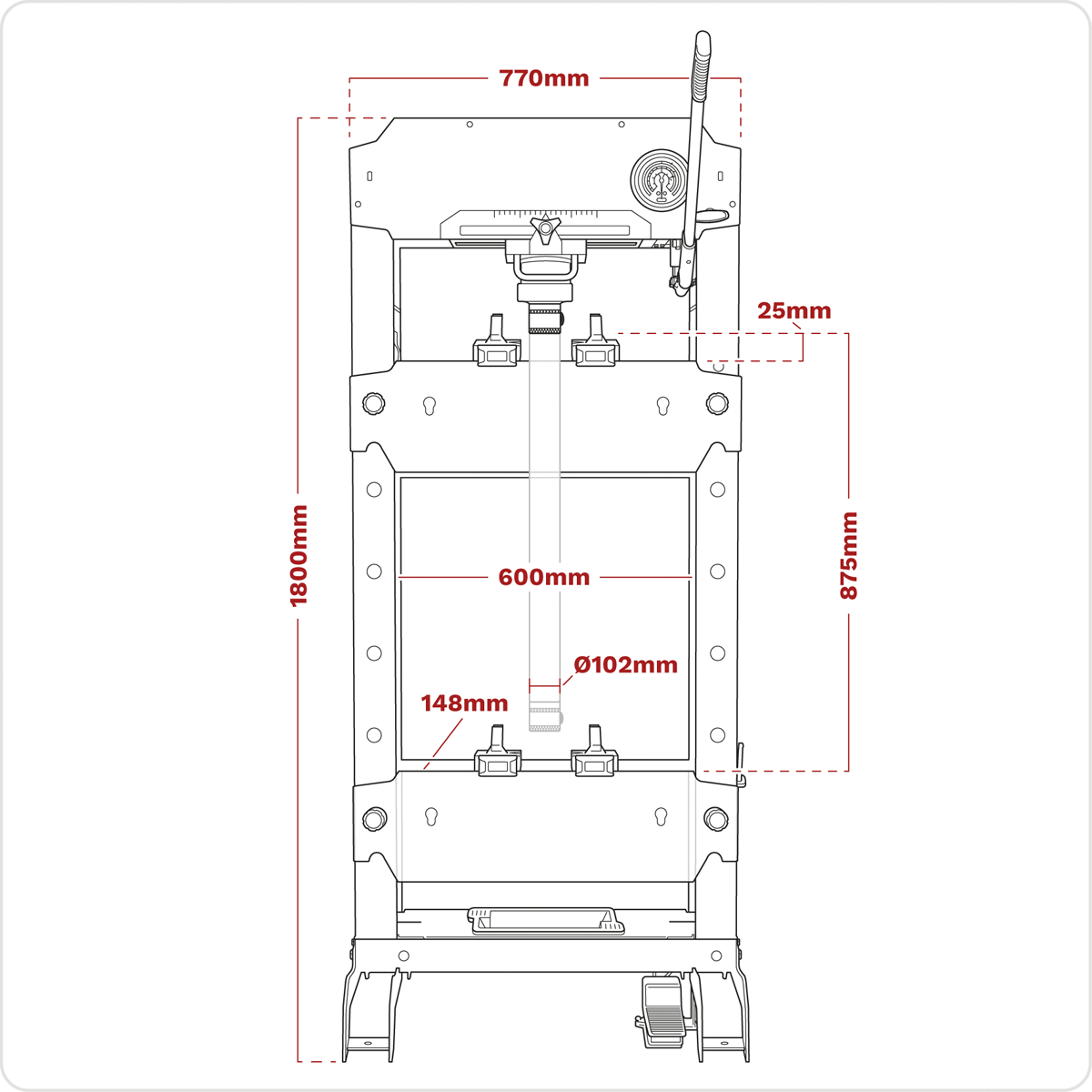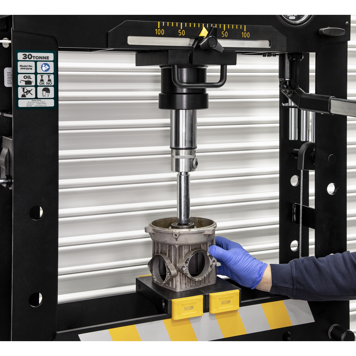 • Sliding hydraulic ram assembly giving 200mm of lateral travel for off-centre pressing applications.