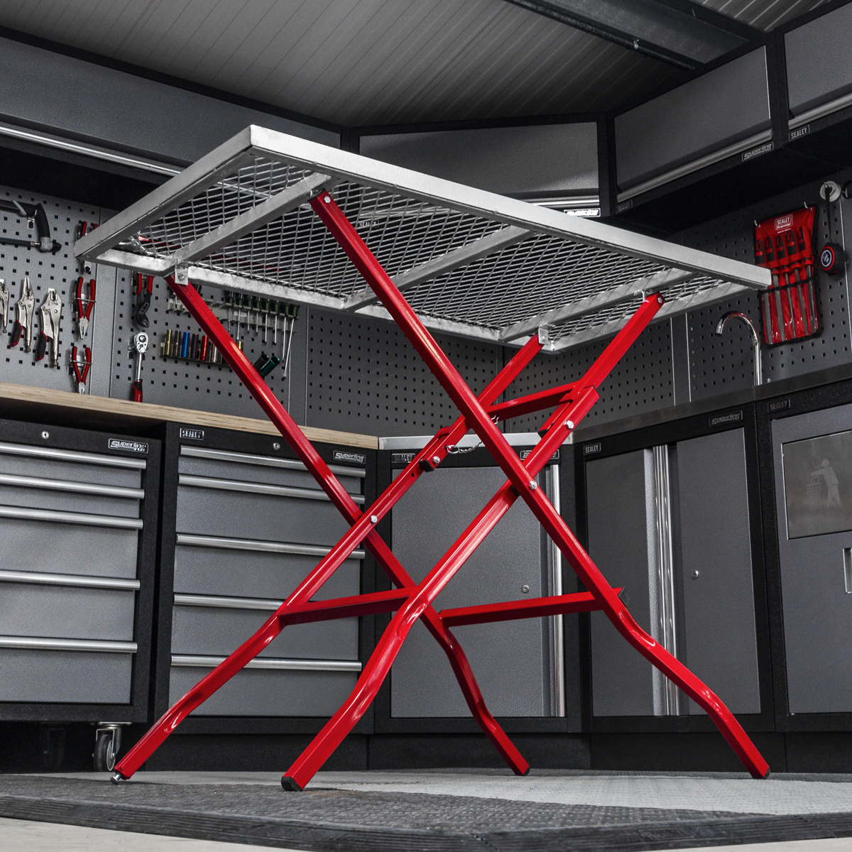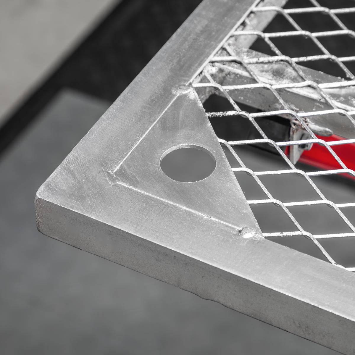 • Heavy-duty galvanized welding table with 30mm MIG torch mounting point.