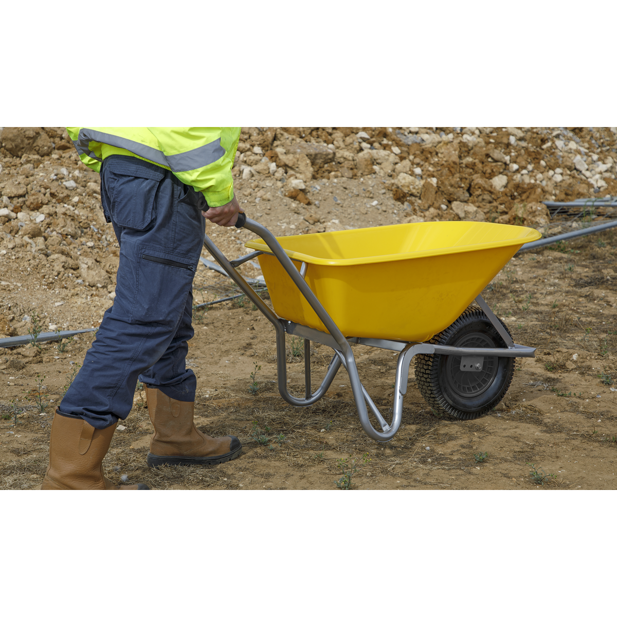 • Our wheelbarrows use air filled pneumatic tyres, perfect for absorbing impact and are ideal for use on uneven surfaces and rough terrain.