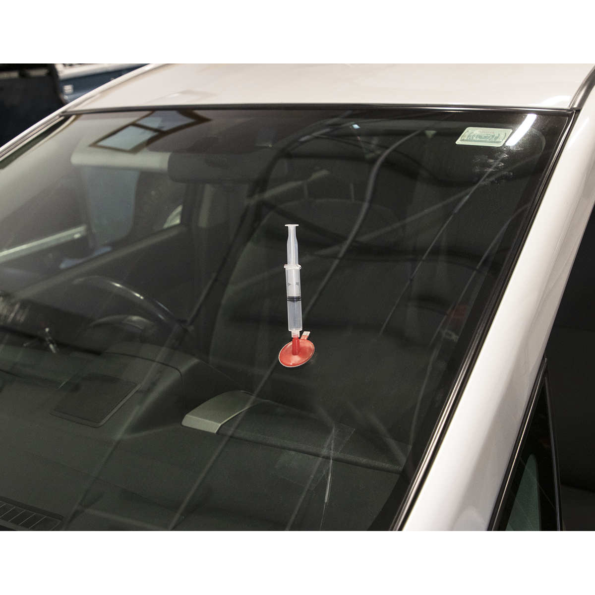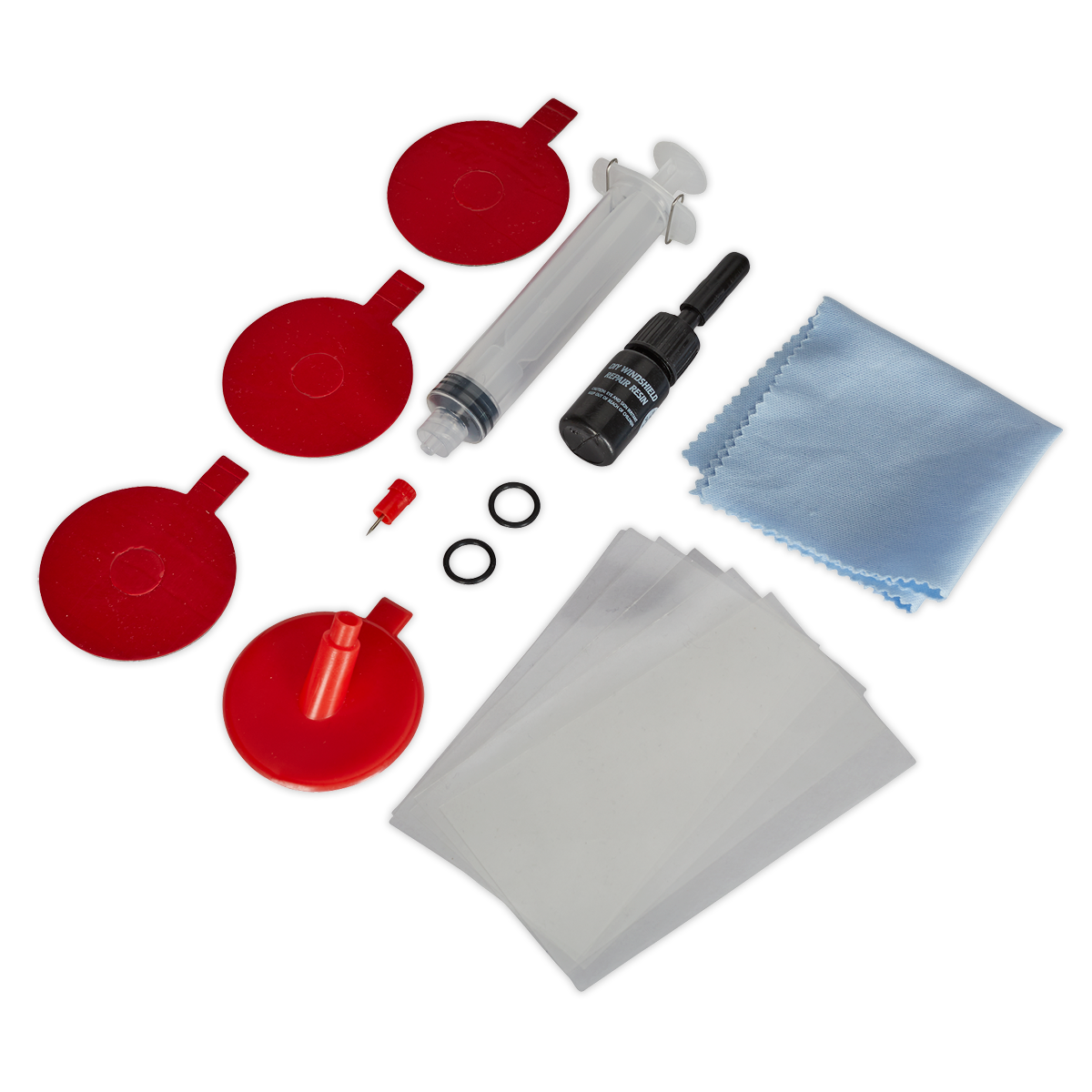 • Contents: Push Pin, Clean Cloth, Adhesive Seal (x3), Black O-Ring (x2), Pedestal, Razor Blade, Repair Resin, Injector, Curing Film (x5).