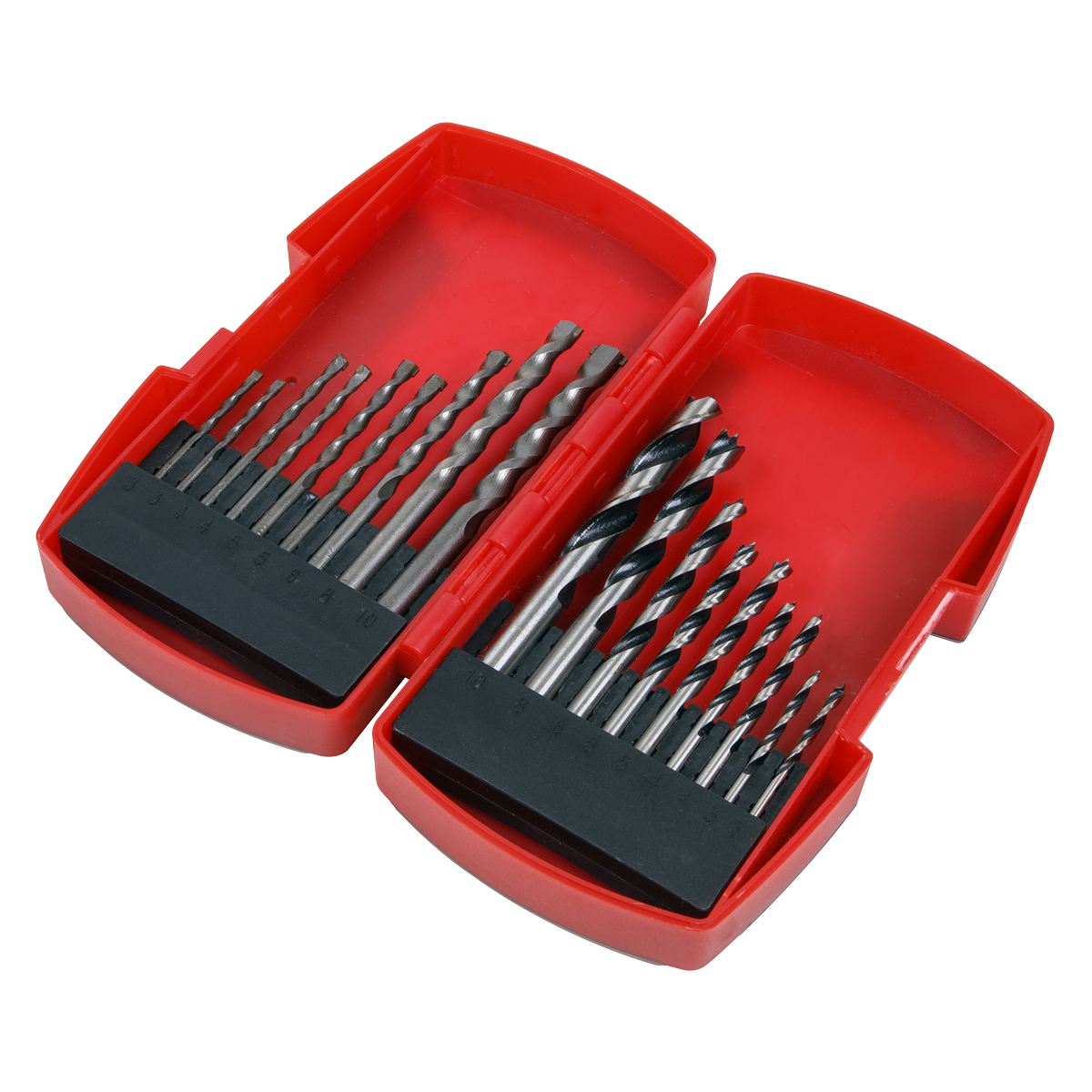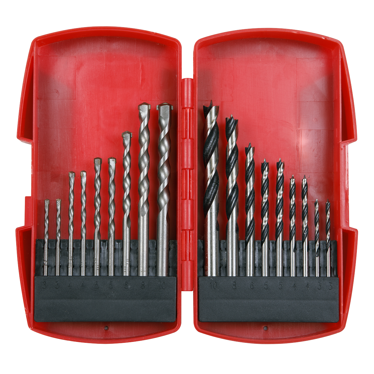• Set consists of nine brad point drills and nine tungsten steel masonry drills.