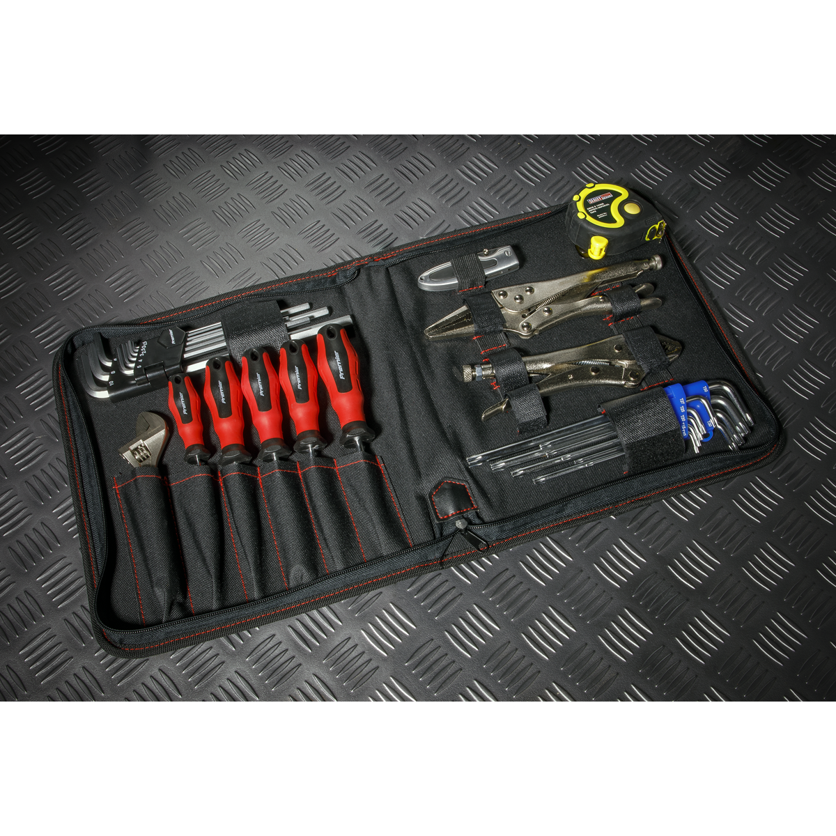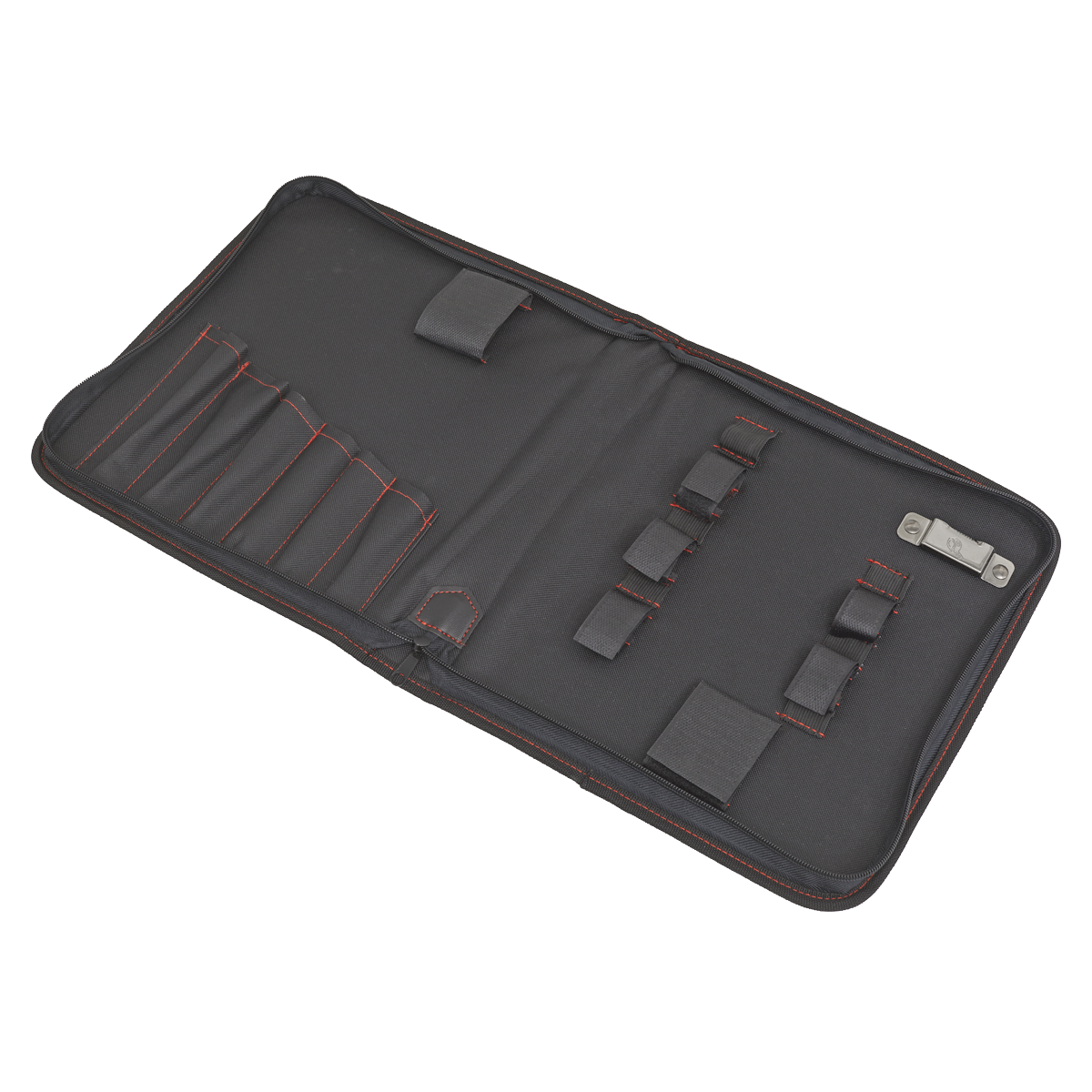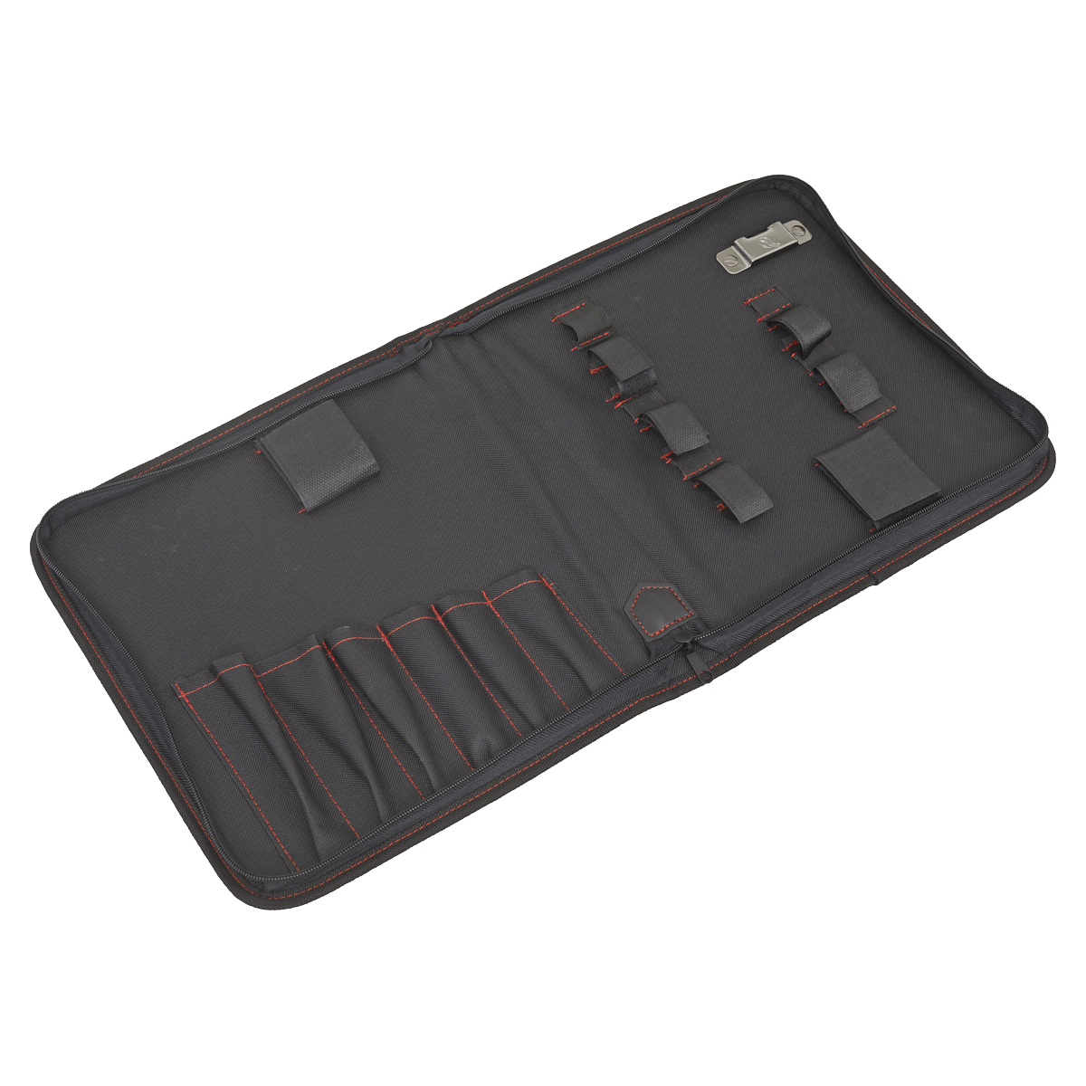 • Contains six pockets for items such as spanners as well as seven adjustable hook-and-loop retainers, six elastic retainers and a metal clip for storing a tape measure.